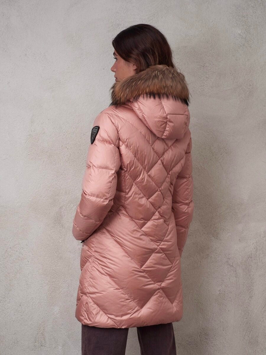 Cappotto in nylon imbottito in piuma e trapuntato.